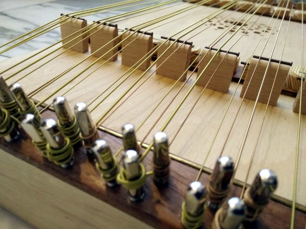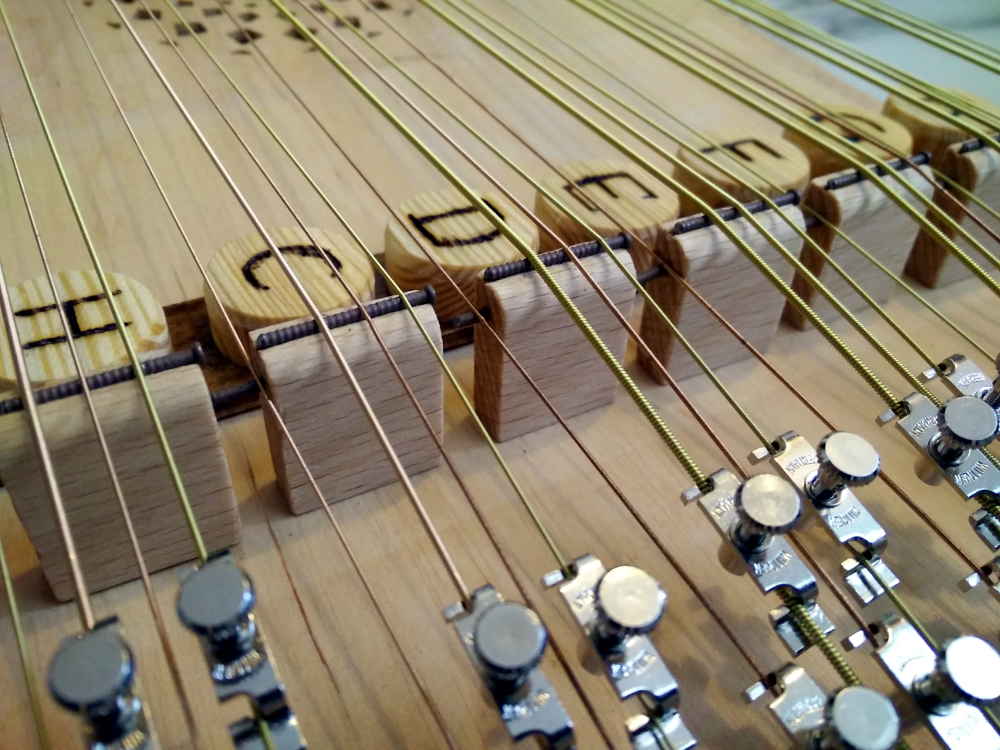 Auf dem Originalinstrument sind 24 Saiten aufgezogen: Jeweils drei nebeneinander liegende Saiten sind derart gestimmt, dass sie einen Akkord bilden, also Grundton + Terz + Quinte. So stehen mit diesem Instrument also 8 Akkorde zur Verfügung (im Original: G- D- A- und E-Moll, sowie B-, F-, C- und G-Dur).