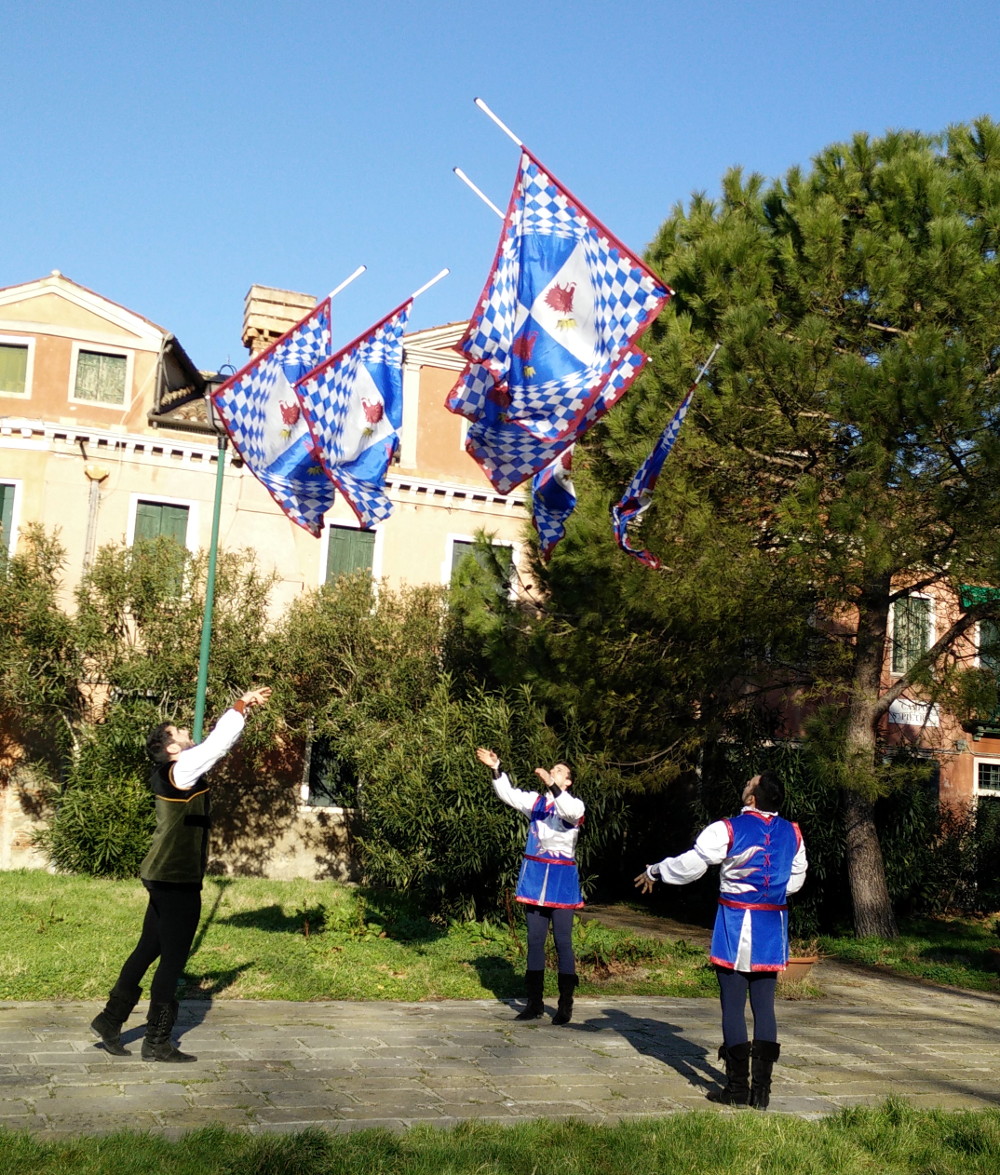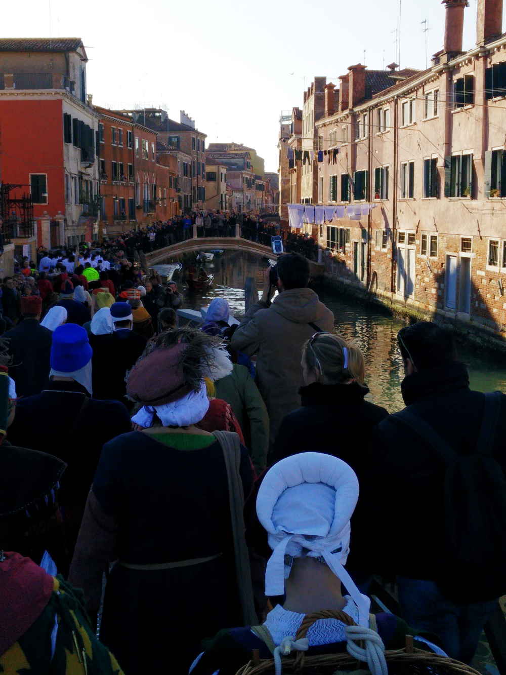 Typisch Italienisch ist der weitere Ablauf: Die Organisatoren selbst kommen verspätet zum Sammelpunkt. Dort lernen sich währenddessen die historischen Gruppen - vornehmlich aus Venedig selbst, aber auch eine Gruppe aus Belgien - bei freundschaftlichen Gesprächen kennen.